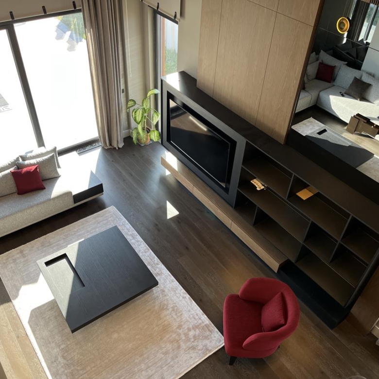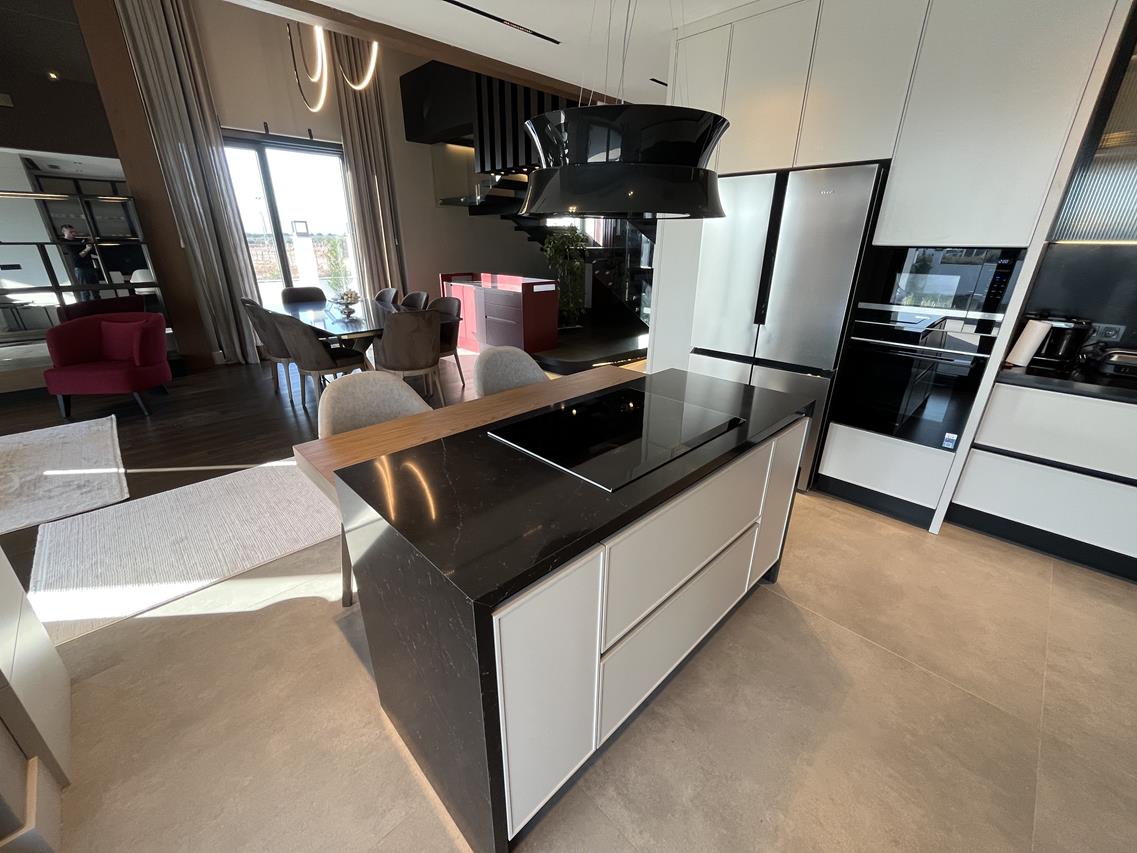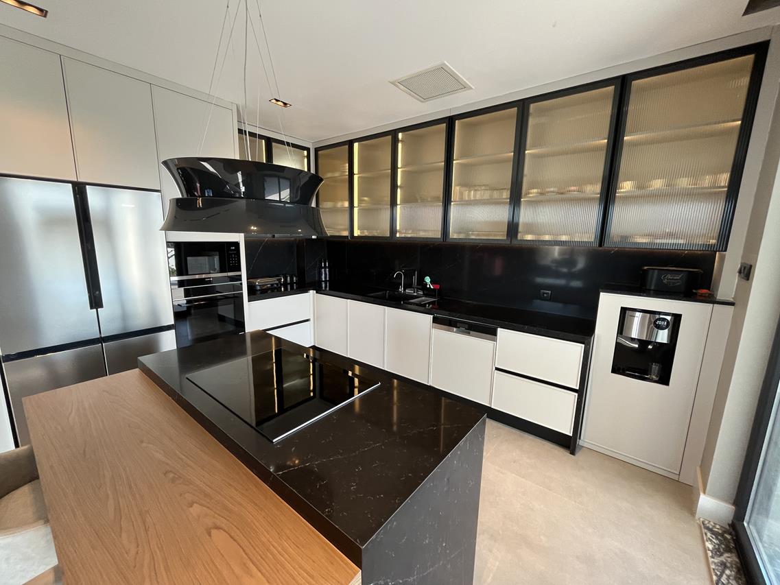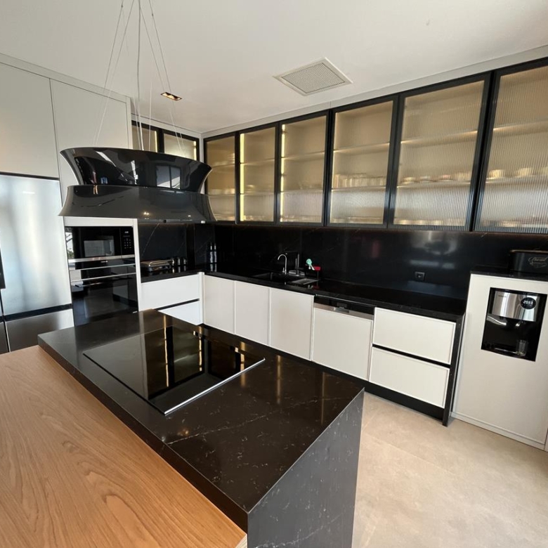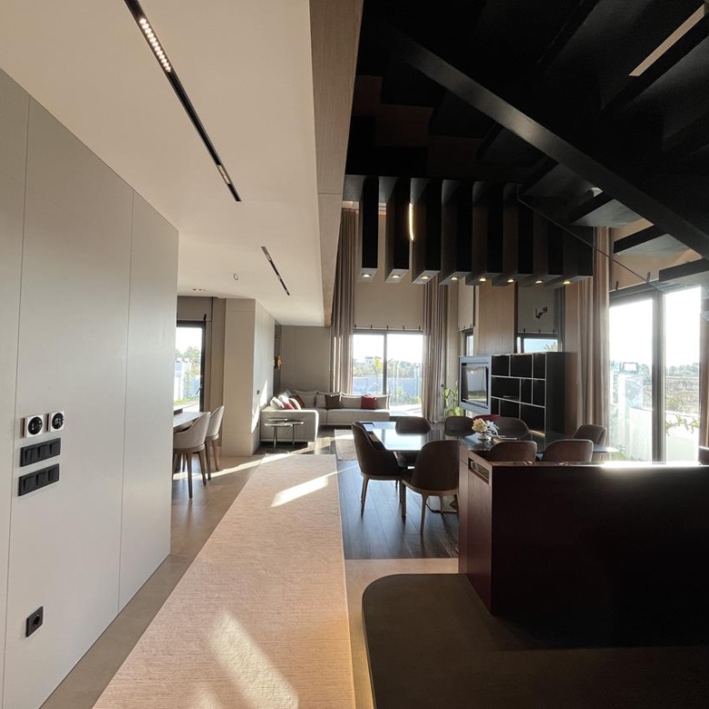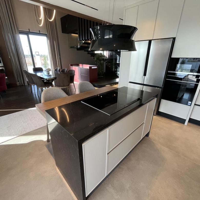 Кухня: Открытая кухня оборудована современной техникой, идеально вписанной в общий дизайн. Это идеальное место для кулинарных экспериментов и уютных семейных ужинов.