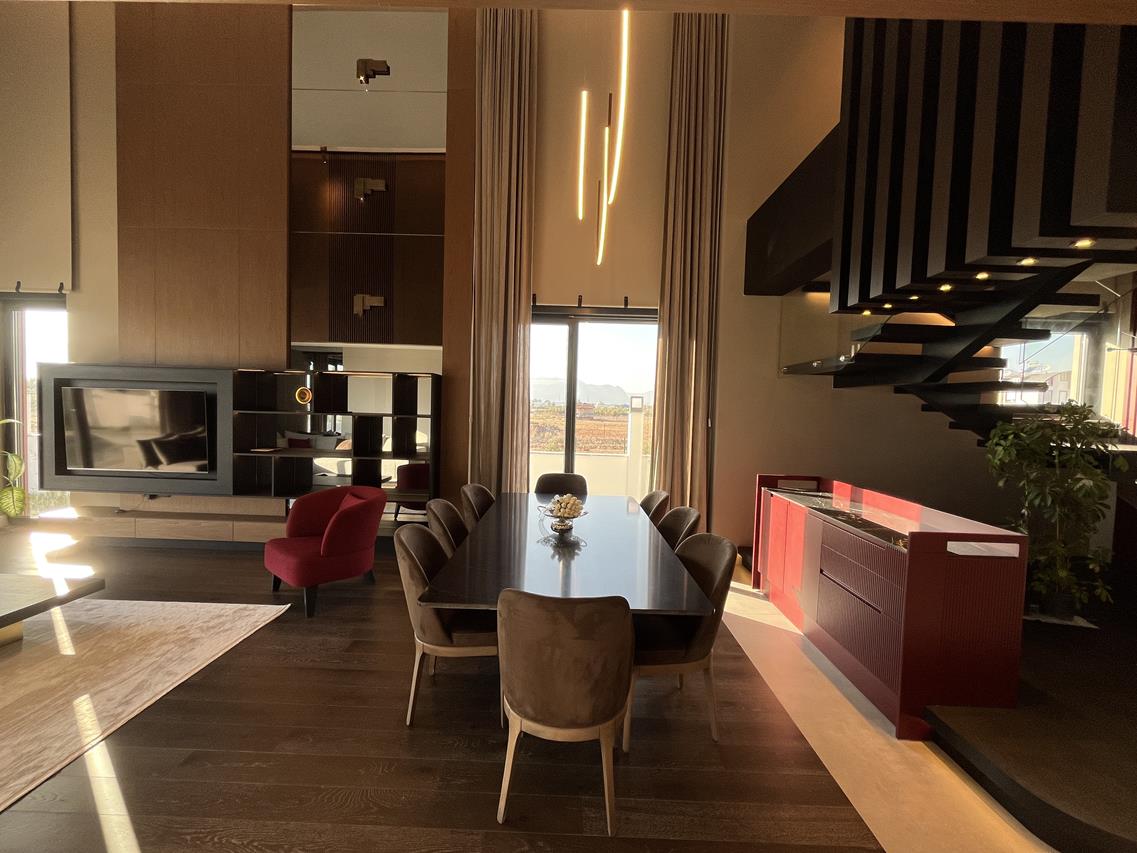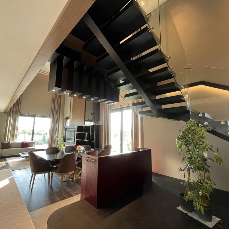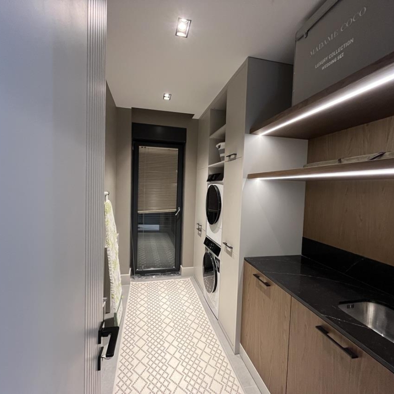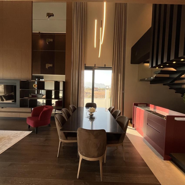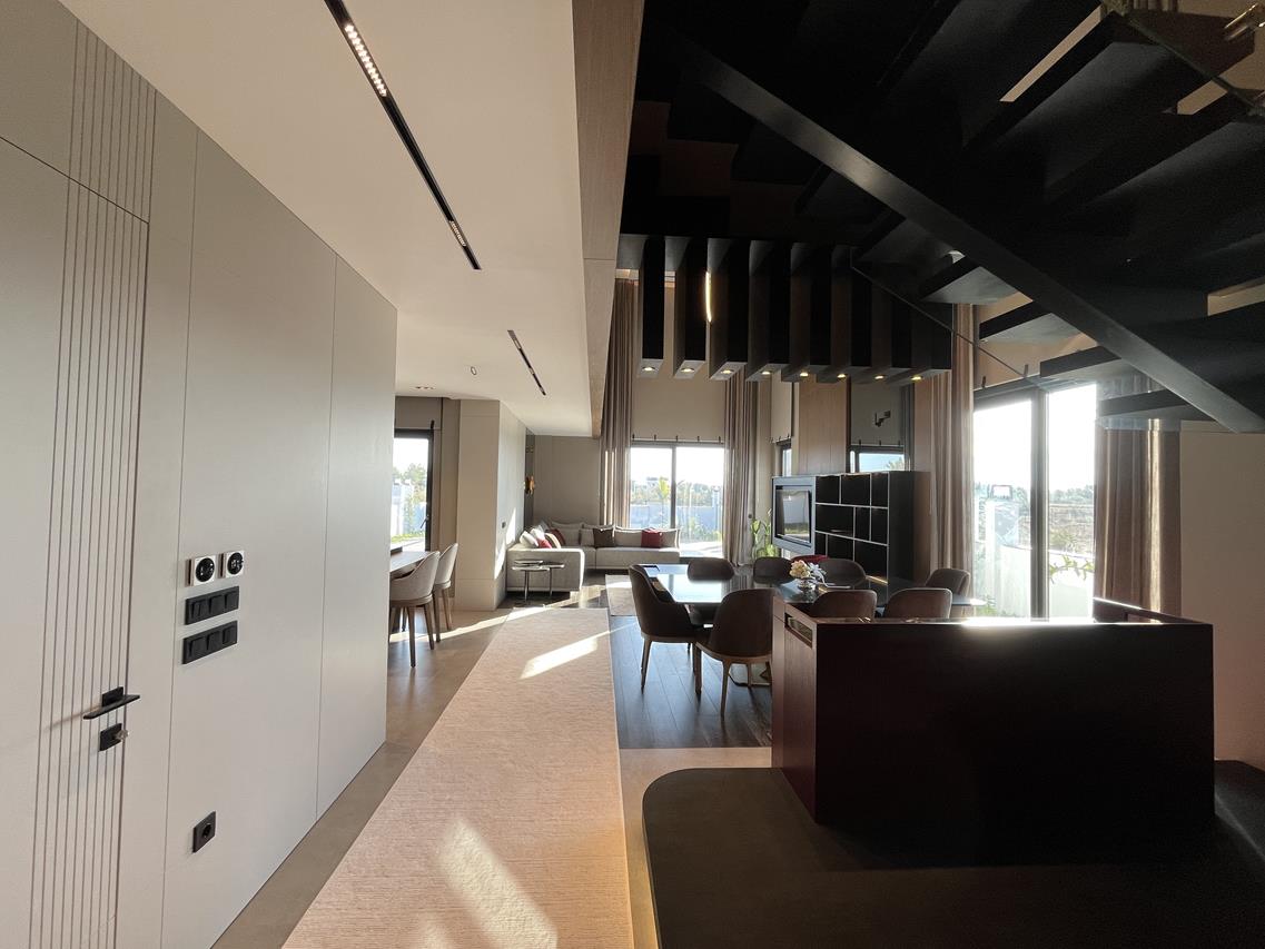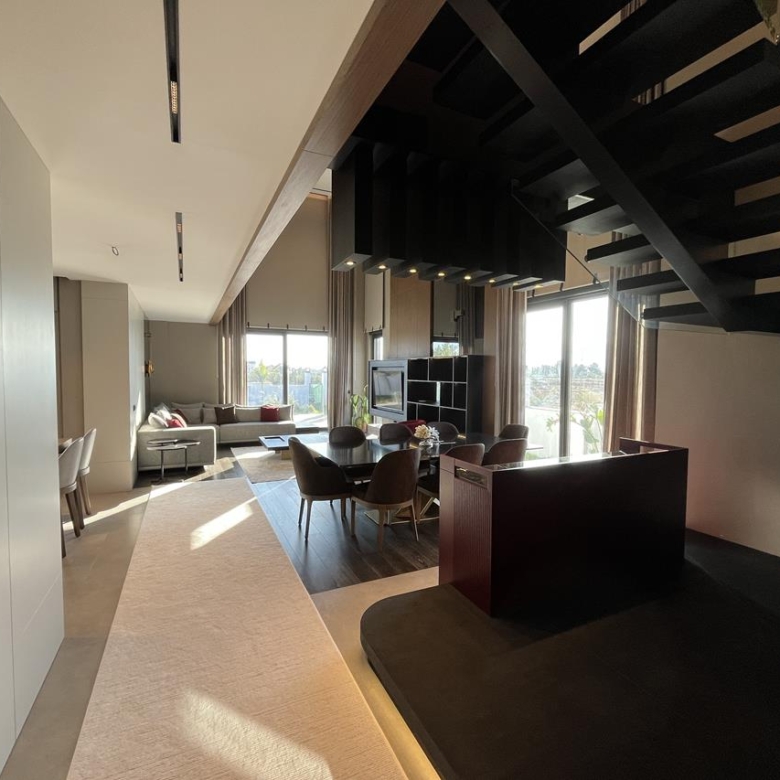 Кухня: Открытая кухня оборудована современной техникой, идеально вписанной в общий дизайн. Это идеальное место для кулинарных экспериментов и уютных семейных ужинов.