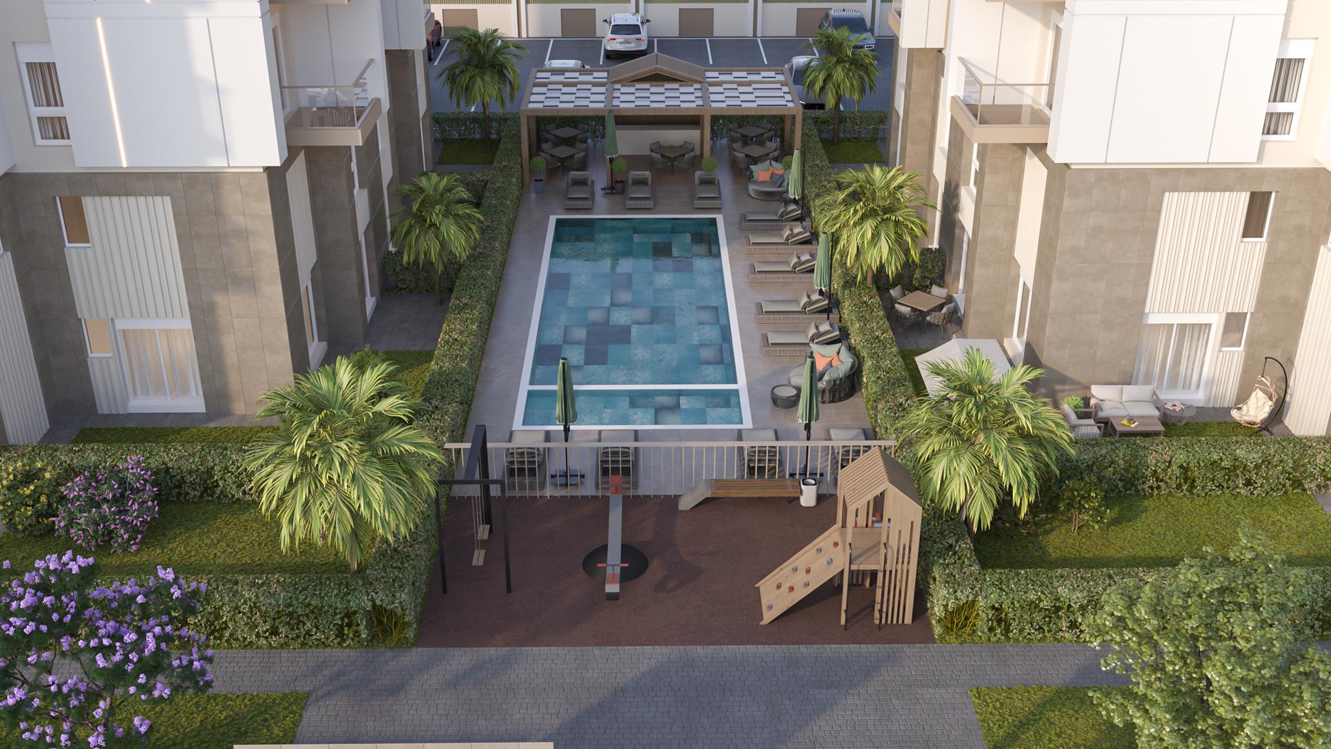 Территория предлагает комфортную жизнь своим жителям с такими удобствами, как открытая парковка, бассейн, зона ожидания, бар у бассейна, беседка, детская площадка и фитнес-зона. Проект, поддерживаемый системой видеонаблюдения и контроля безопасности, включает в себя генератор для общих зон, спутниковую систему, систему очистки воды и гидрофорную инфраструктуру.