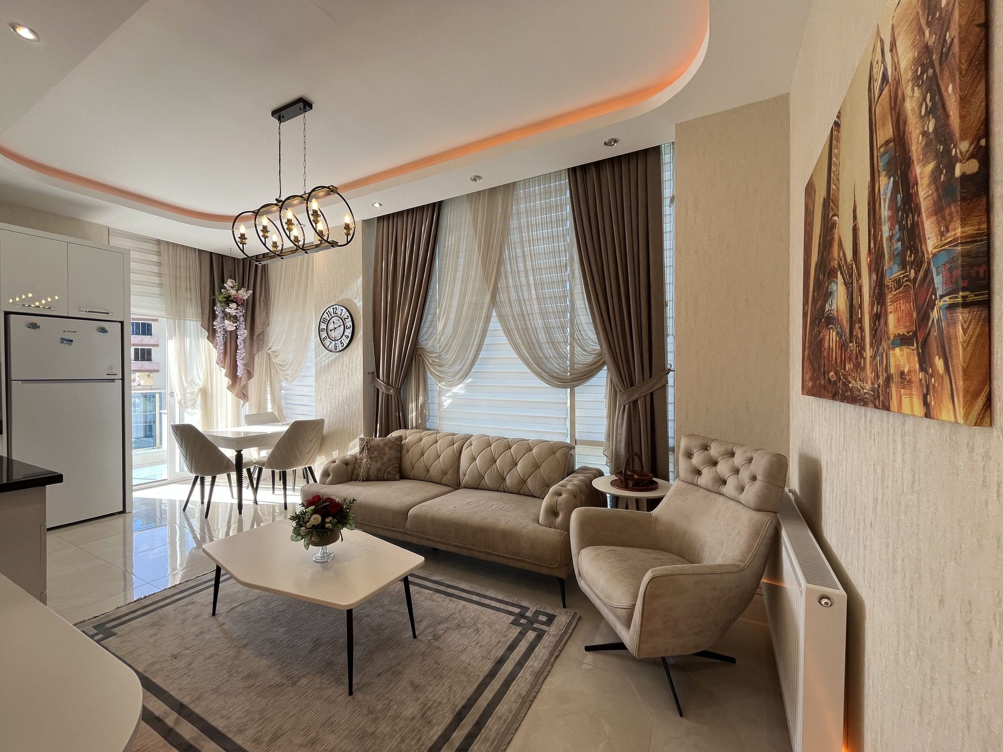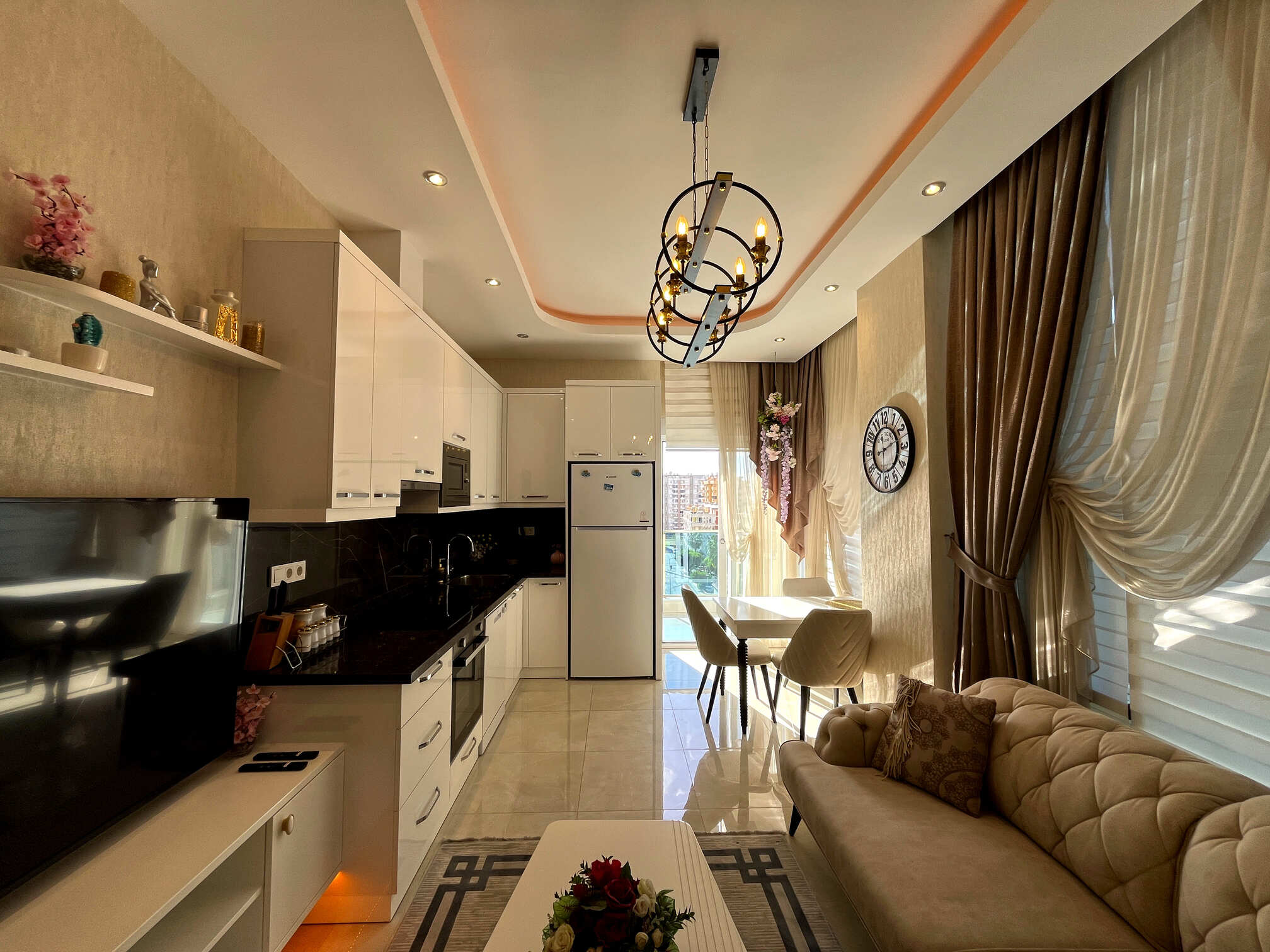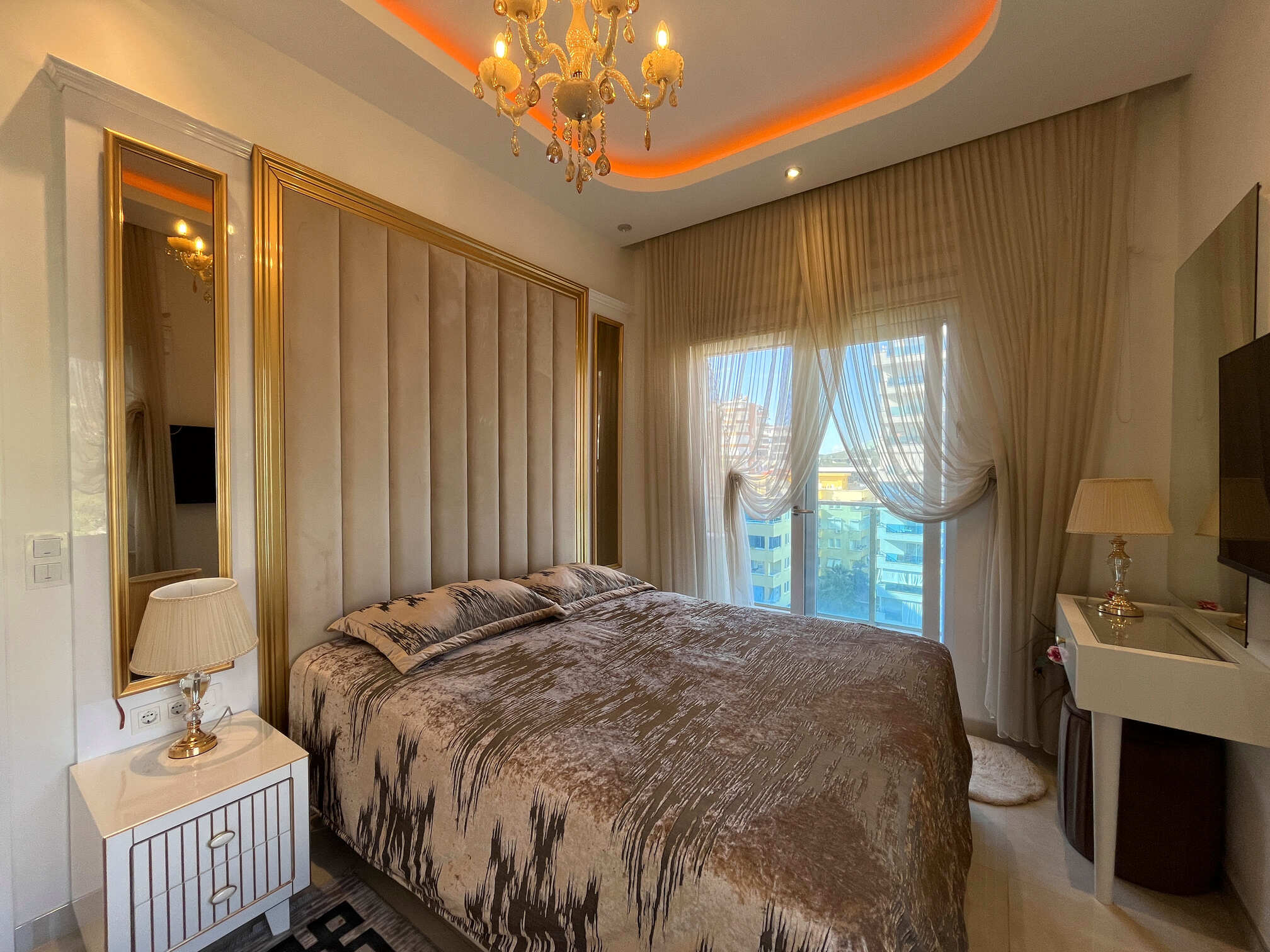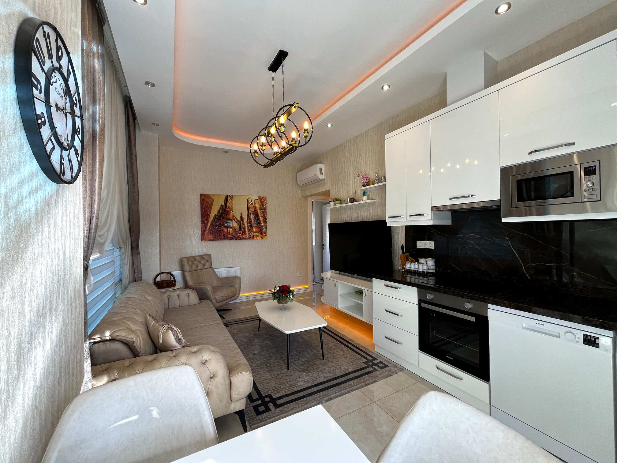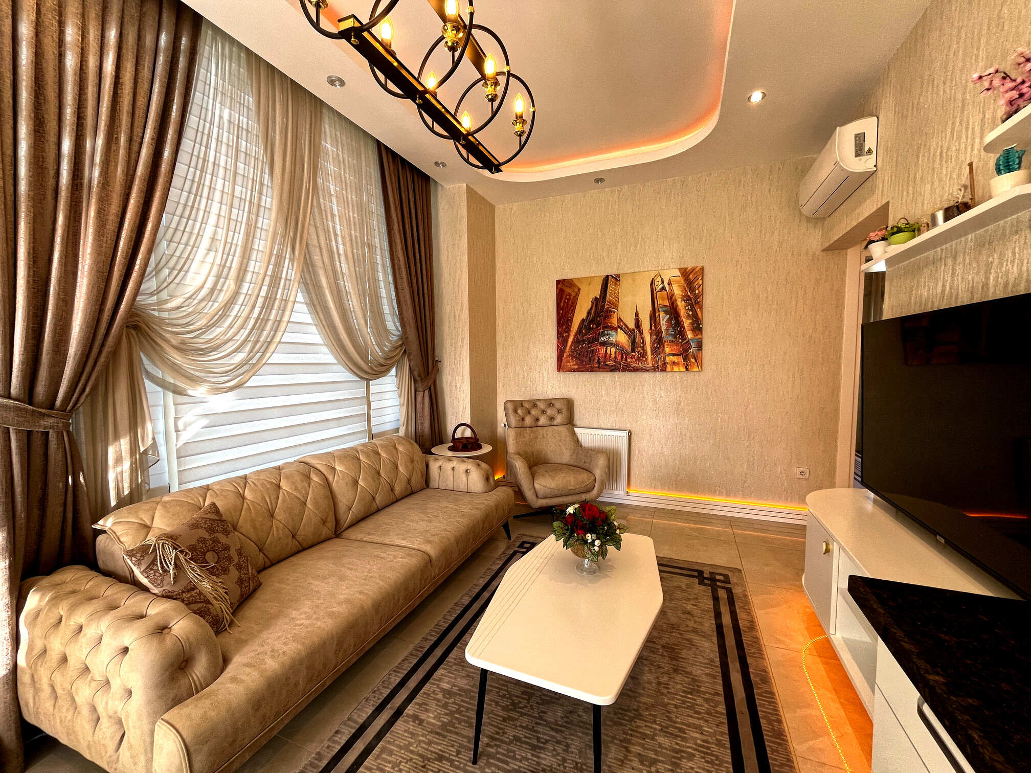 Квартира полностью меблирована и готова к вашему заселению. Интерьер выполнен в благородных кофейно-бежевых тонах с золотыми акцентами.