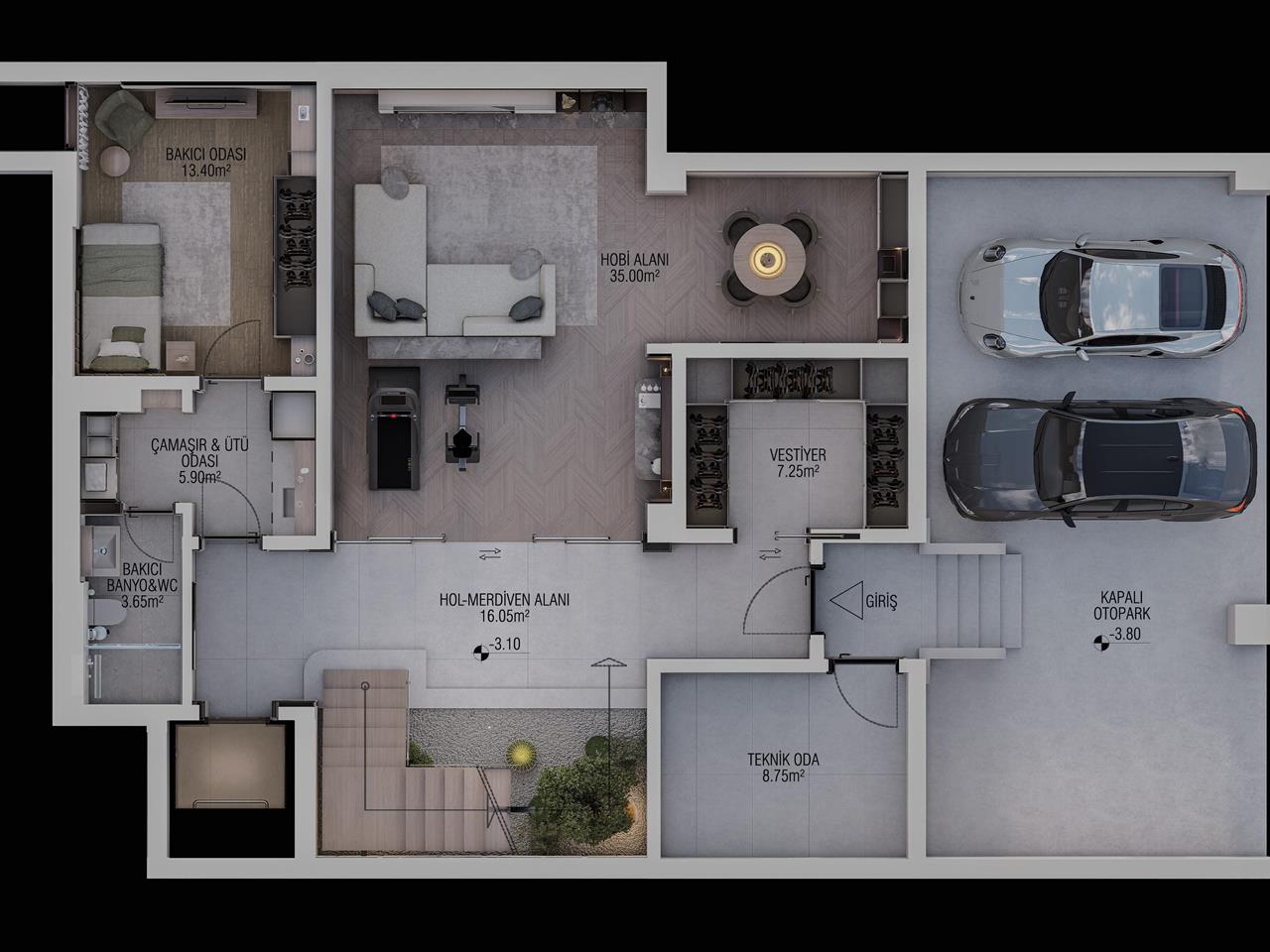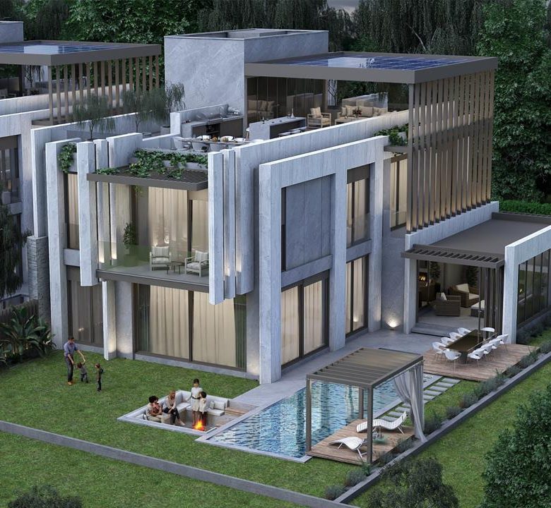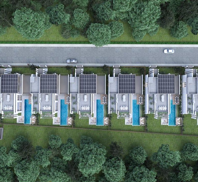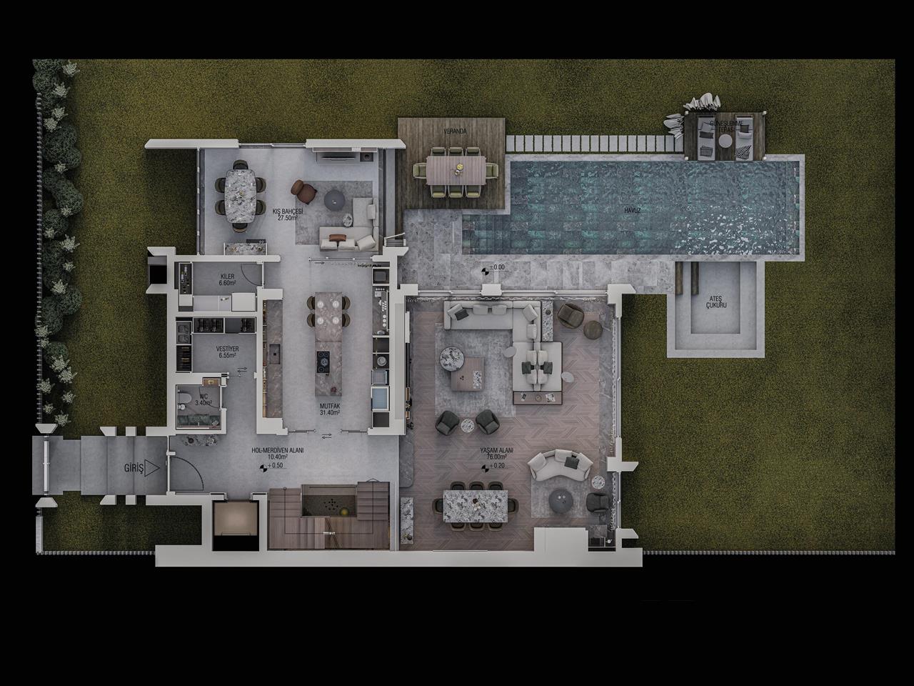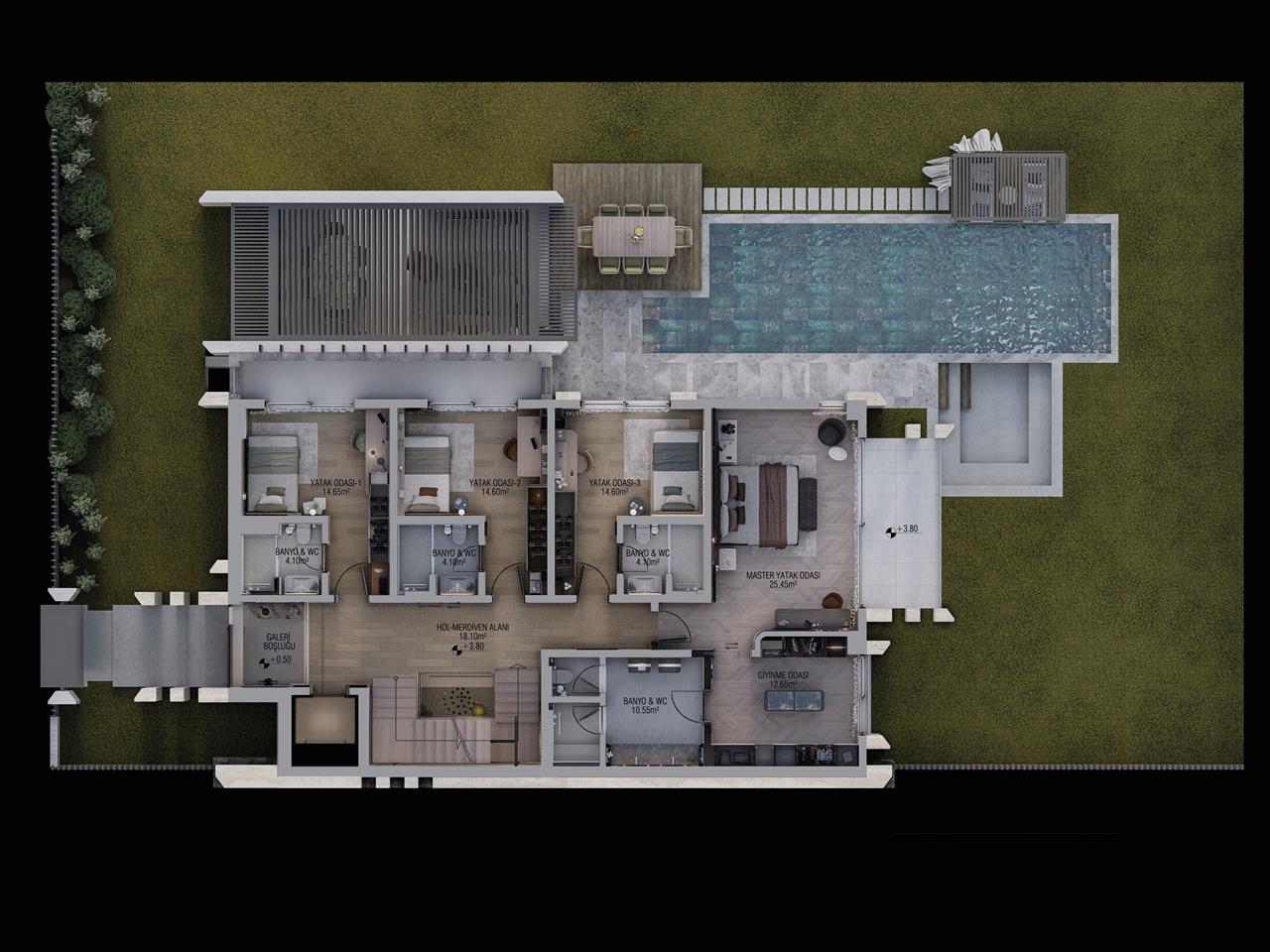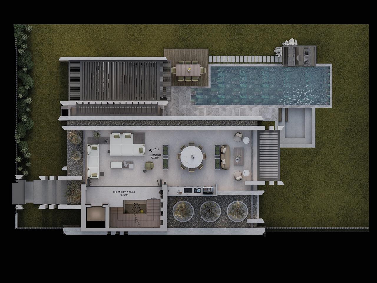 Этот проект, расположенный в районе Эрменек, Анталья, на участке земли площадью 4552 м2., будет состоять из 8 отдельных вилл. Каждая вилла, площадью от 480 м2 до 698 м2, полезной площадью 455 м2, с 5 спальнями, будет оборудована частным бассейном, крытой парковкой, лифтом, подогревом полов, кондиционерами, камином, внешним камином – очагом и зимним садом. Виллы будут генерировать значительную часть собственной энергии за счет солнечных батарей на крышах.