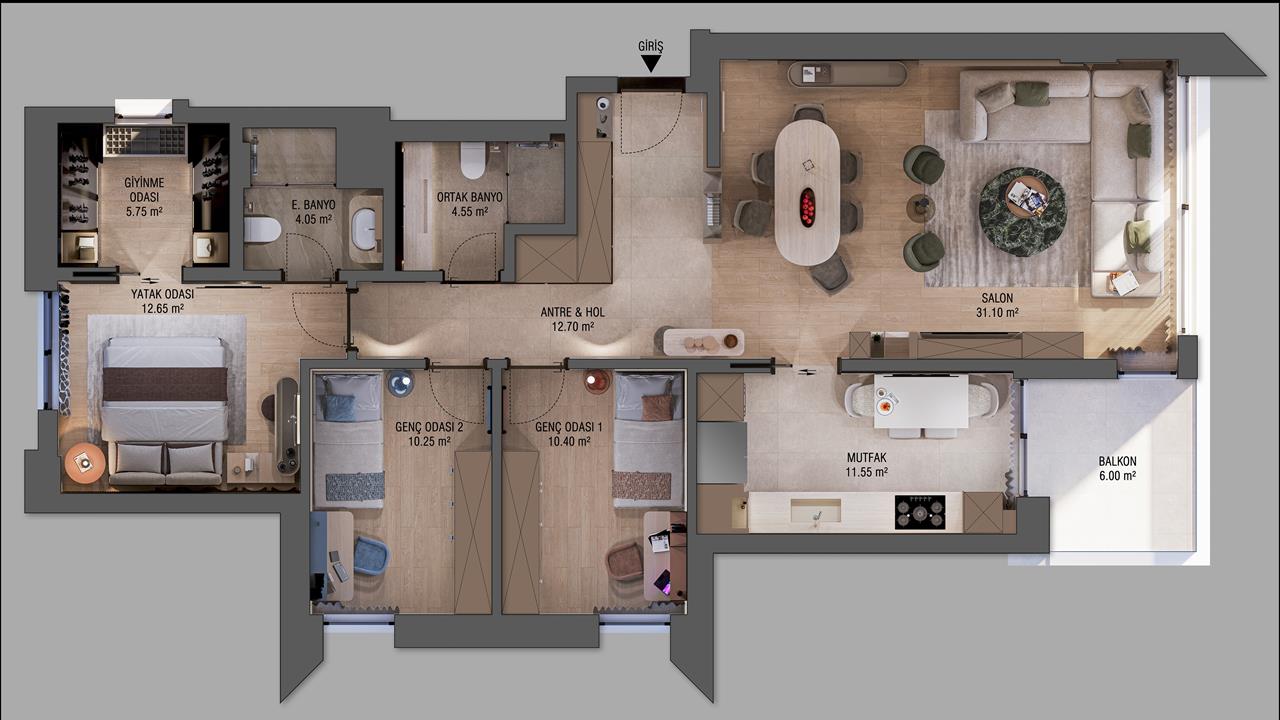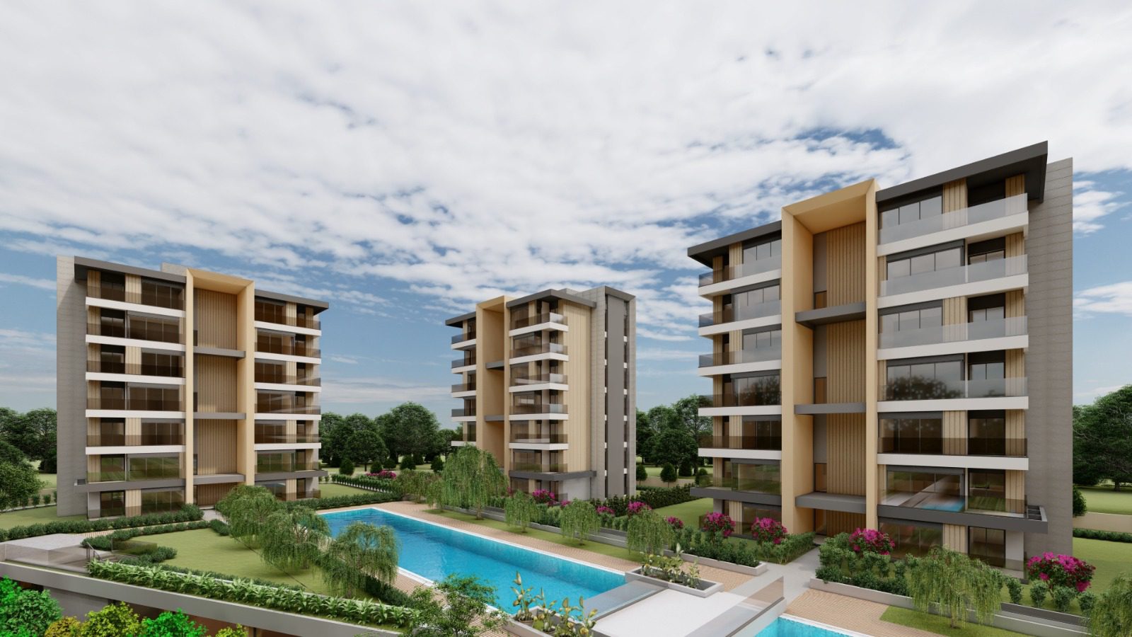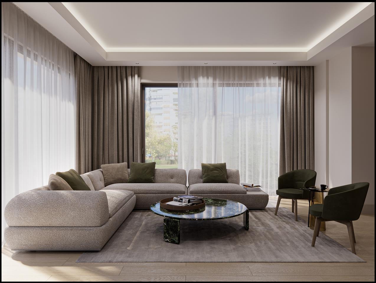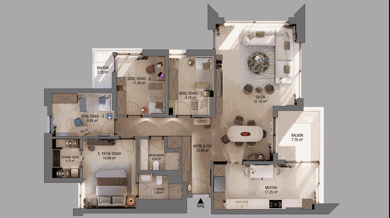 Комплекс предлагает просторные квартиры двух типов: 3+1 и 4+1, сочетающие современную архитектуру, качественные материалы и продуманную инфраструктуру.